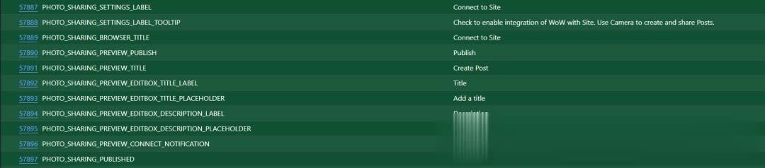 其次,测试服的GlobalStrings.db2文件中,新增了一大批与“照片分享”(PHOTO_SHARING)相关的代码字符串,每一条都直指“跨平台分享”功能。这些字符串中反复提及“连接至APP”“发布帖子”“添加标题和描述”等操作,甚至包含发布失败、每日发布上限等细节提示,比如“帖子已发布至外部网站”“你已超过每日发布上限”“必须连接至站点才能发布”等,完整覆盖了从连接到发布的全流程。